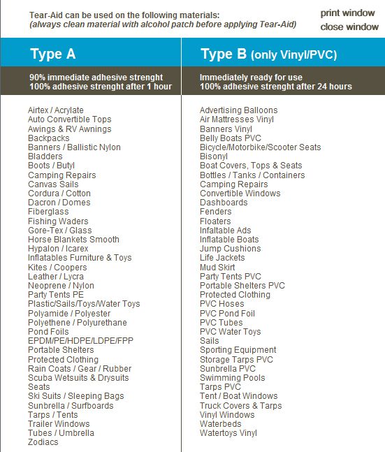 Stoffreparatur: mit dem Tear-Aid repariert man auch unter anderem Segeltuch, Gummi, PVC, (aufblasbare) Boote, Sonnenschirme, Regenschirme, Mäntel und Taschen. Mann repariert sogar auch Produkte aus Aluminium, Edelstahl, Polyester und weiteres. Tear-Aid ist verfügbar in den Typen A und B. Beide haben die gleiche einzigartige Qualität sind aber zu verwenden auf unterschiedliche Art und Weise.